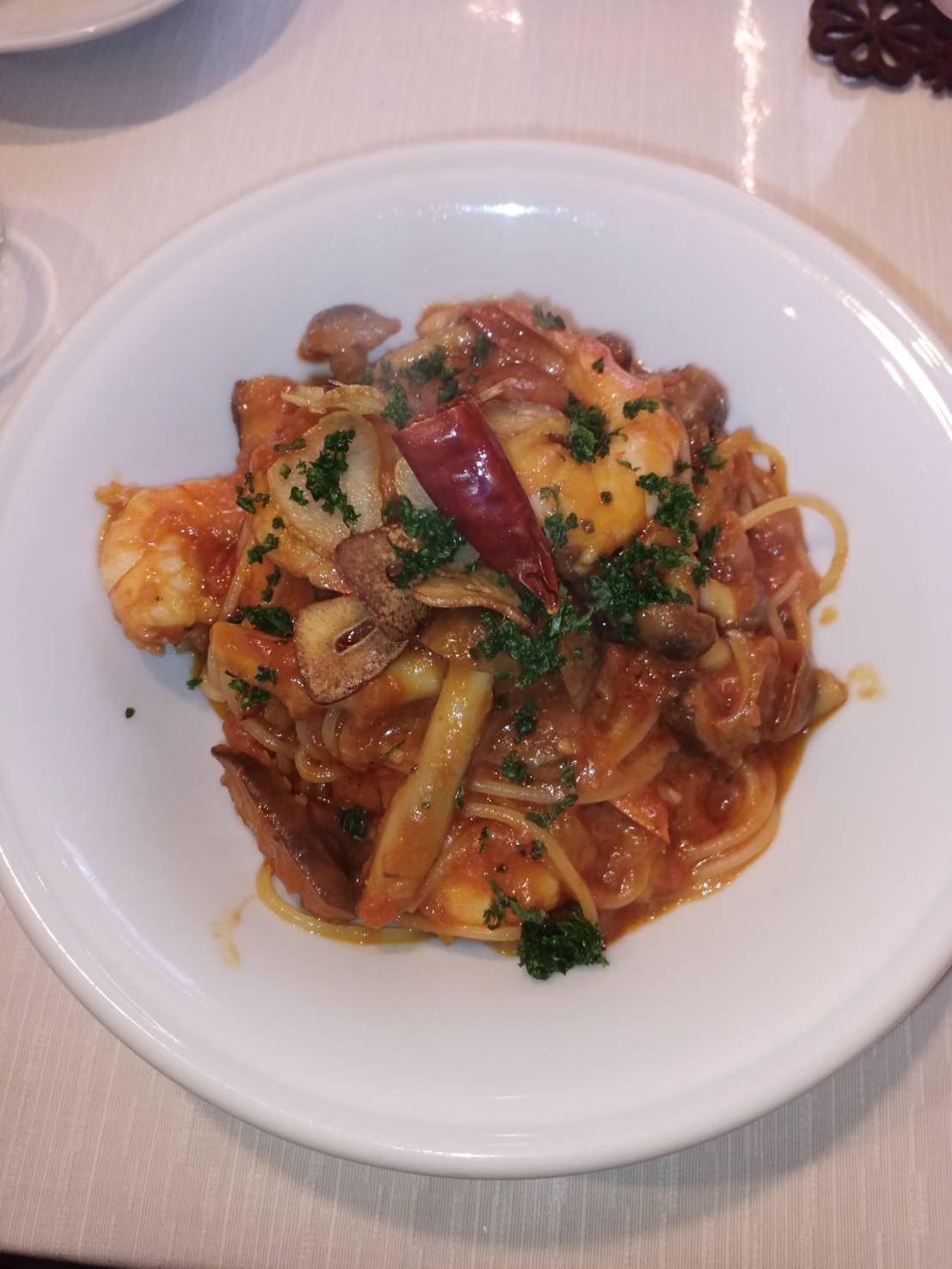 2. エビとキノコのトマトソースパスタ